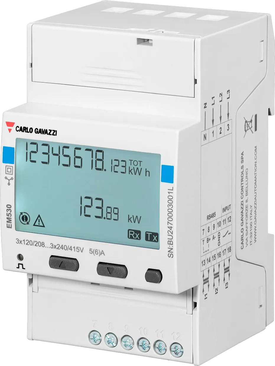 - Электросчетчики — EM511 (1‑фазный), EM530 (3‑фазный) и интеграция с WattNode/Carlo Gavazzi: измерение U, I, P, kWh, PF, Modbus RS‑485 для интеграции в локальные системы и шины.