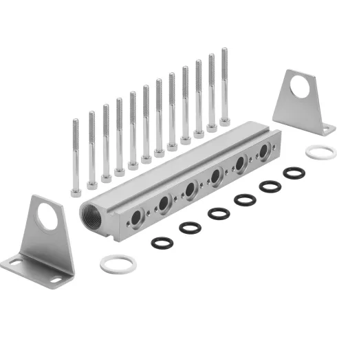 Типовые сборки: монтажный набор для линии 8 мм (фитинги, манометр, фильтр 5 µm), FRL-блок для 1000 Nl/min с адаптером на DIN-рейку, комплект глушителей и обратных клапанов для цилиндров ISO 15552, набор запасных уплотнений и монтажных скоб.