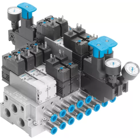 - VTSA / VTSA‑F (CPX) — модульный терминал высокого класса: смешение типоразмеров клапанов, до 32 позиций, расширенные диагностические и Safety‑функции, широкий диапазон расходов (сотни–тысячи л/мин).