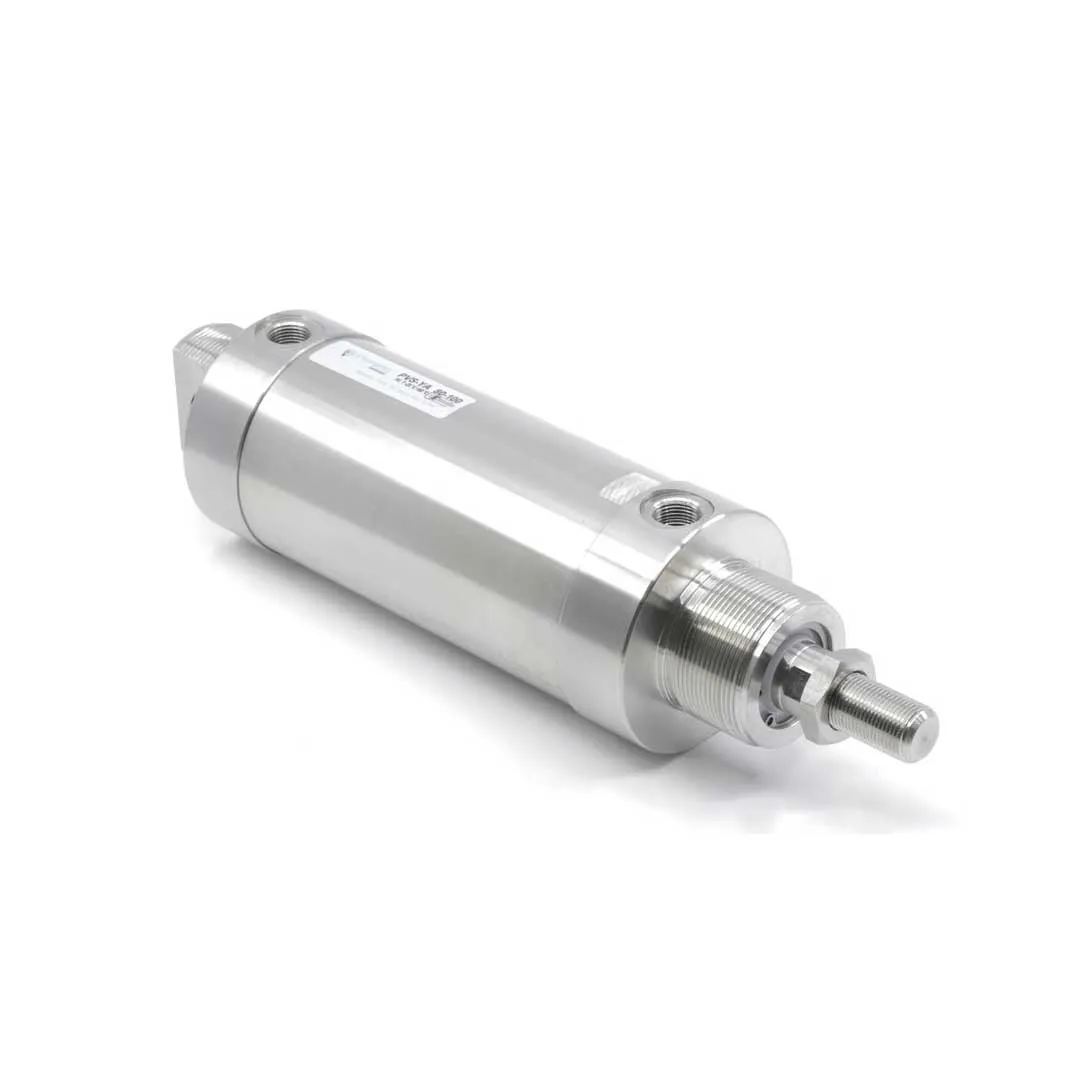 Пневмоцилиндры PVSA работают при давлении 1-10 бар, номинальное 6 бар, обеспечивают усилие от 50 Н (диаметр 32 мм) до 5000 Н (диаметр 100 мм) в зависимости от площади поршня. Конструкция включает алюминиевый анодированный корпус, хромированный стальной шток диаметром 12-25 мм, полиуретановые уплотнения поршня и штока. Магнитный поршень совместим с датчиками положения стандарта ISO 15552, крепление по пазу T-slot или резьбовым отверстиям. Рабочая температура от -10 до +80 °C, среда — сжатый воздух с точкой росы -20 °C и фильтрацией 40 мкм. Скорость штока 50-500 мм/с регулируется дросселями в пневмолинии. Ресурс 10 млн циклов при номинальной нагрузке, соответствие ISO 15552 и ISO 6432 для взаимозаменяемости с цилиндрами других производителей. Демпфирование: пневматическое регулируемое или эластомерные буферы для снижения ударов на конечных позициях.