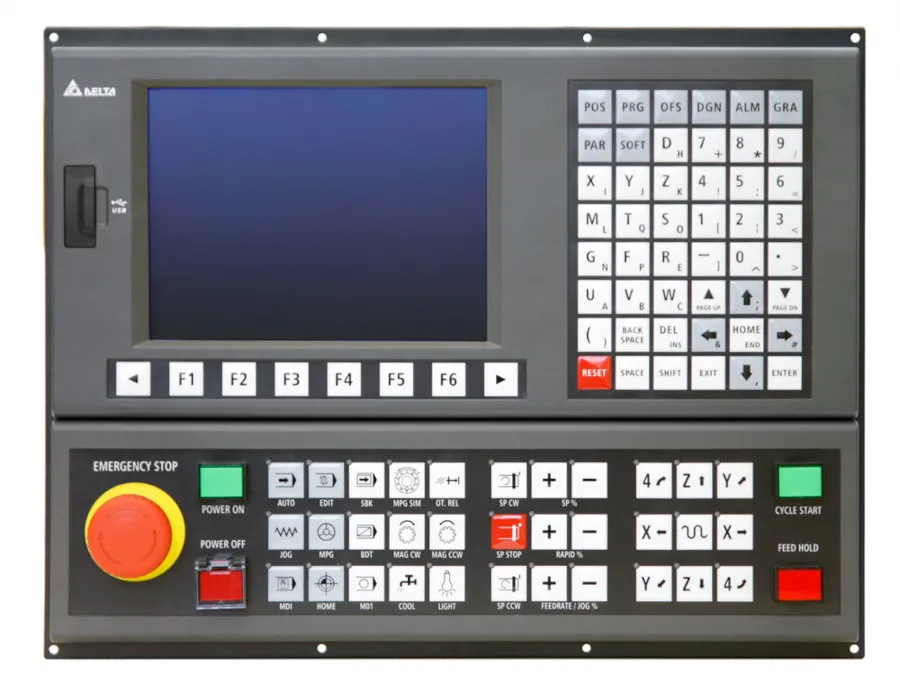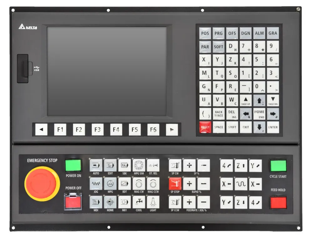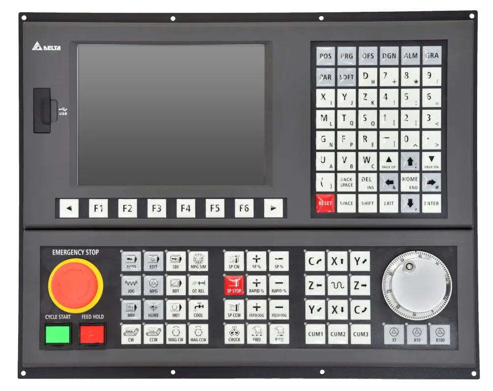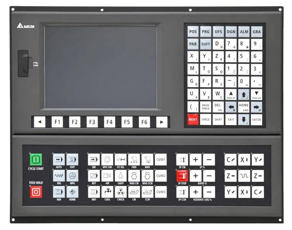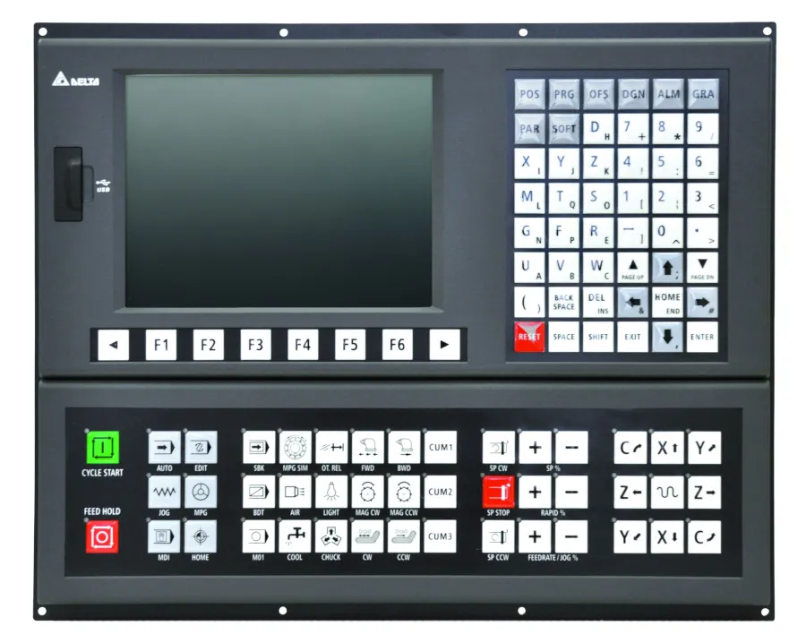 Delta сегментирует системы ЧПУ по назначению и числу осей: компактные контроллеры для простых фрез/порталов, специализированные решения для токарных станков, полнофункциональные графические контроллеры с HMI и открытые контроллеры для OEM/интеграторов (DMCNET/ethernet).