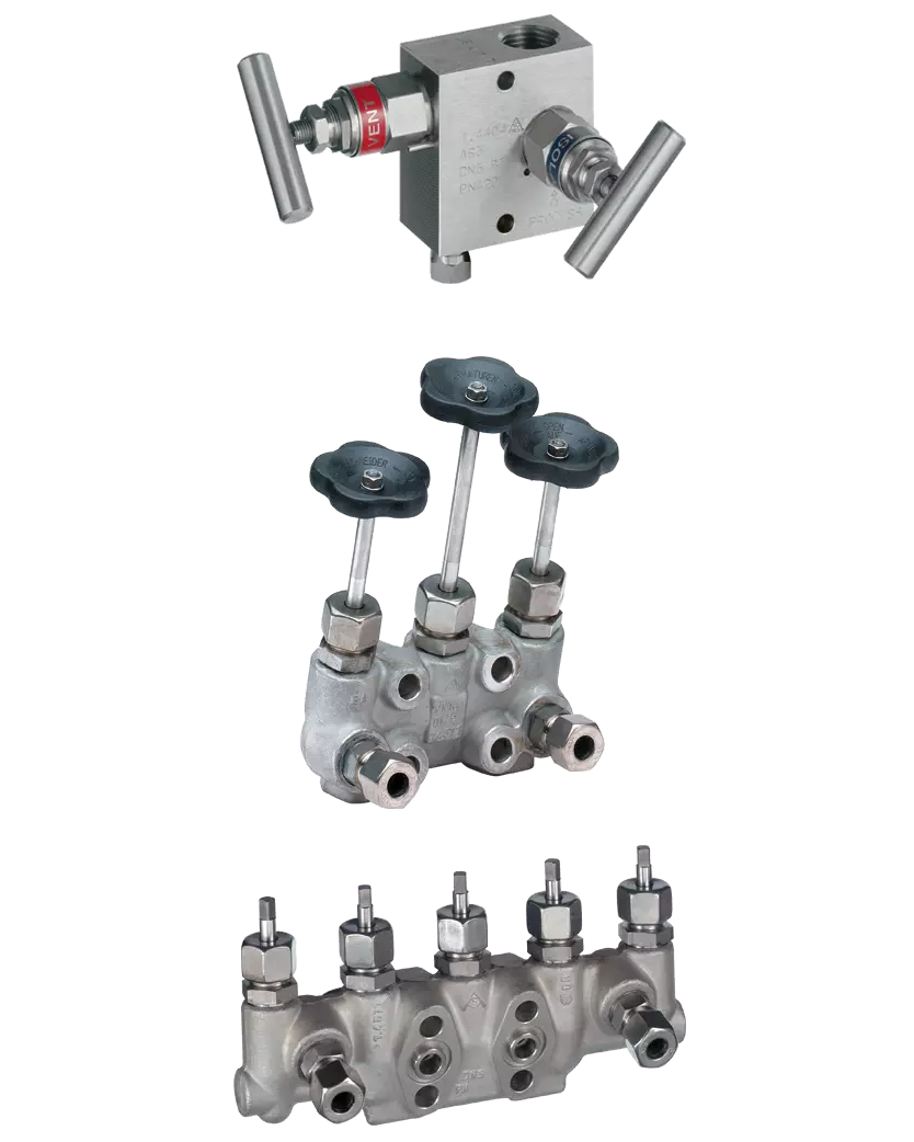 - Клапанные блоки (2/3/5‑valve block) — PN до 420, DN малых размеров; назначение: изоляция и переключение при снятии показаний; особенность: компактная интеграция с преобразователями давления.