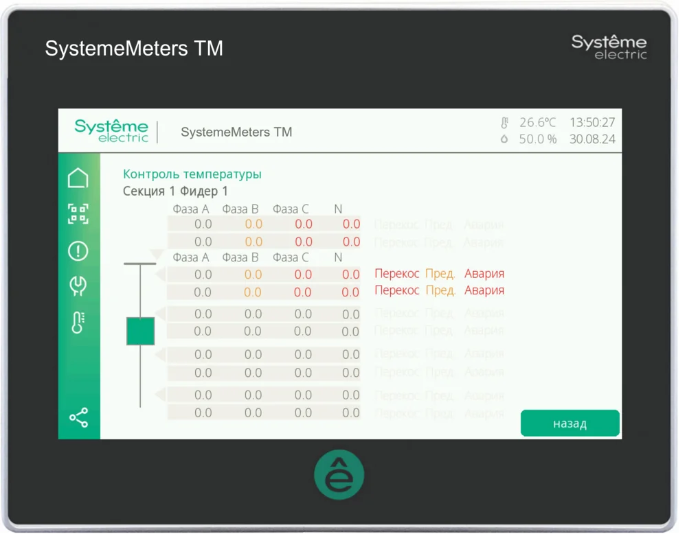 Параметрирование выполняется через интуитивно понятный графический интерфейс панели, где пользователь может задавать и изменять настройки подключенных устройств в режиме реального времени, включая параметры защиты, мониторинга и диагностики, что обеспечивает гибкую и точную настройку системы распределения.